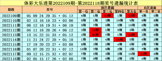 上期回顾:大乐透第2022118期奖号为:02 05 15 17 26 + 02 08,各位号码遗漏期数分别为:7期、8期、0期、2期、5期+0期、2期,前区遗漏总值为22期,后区遗漏总值为2期。