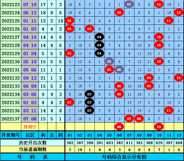 后区分析:上期后区开出全大组合:07+08,最近10期后区奖号大小比为8:12,本期后区注意一大一小组合回补,关注两码06、10。