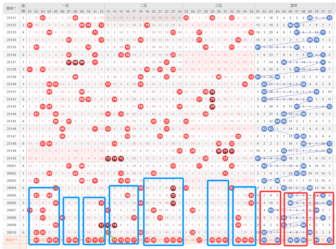 先回顾上期,特征:奇偶比2:3,区间比是2:2:1,质合比为3:2,1个红球重号,1组连号,0个邻号,2个孤号,蓝球小大组合,偶数奇数组合。