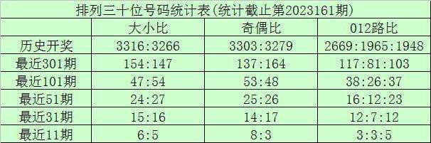 上期回顾:排列三第2023161期奖号为:536。奖号形态组六,大小比2:1,奇偶比2:1,012路2:0:1。