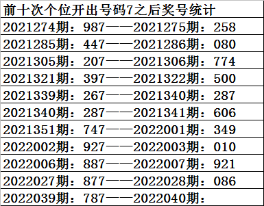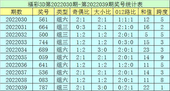一、上期开奖:福利彩票3D第2022039期奖号为787。奇偶比为2:1,大小比为:3:0,奖号和值为22,奖号跨度为1。