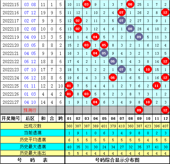 前区一号球尾数:该位上期开出尾数2下降2点,最近5期该位尾数升平降走势为:降→平→升→升→降,前10期尾数升平降比例为3:4:3,前30期尾数升降平比例为12:15:3,本期注意该位尾数上升,看好尾数4。