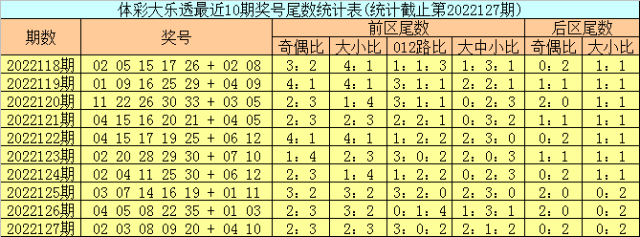上期回顾:体彩大乐透第2022127期开出号码:02 03 08 09 20 + 04 10,其中前区奖号尾数奇偶比为2:3,大小比为2:3,012路比为3:0:2,大中小比为2:1:2,后区奖号尾数奇偶比为0:2,大小比为0:2。