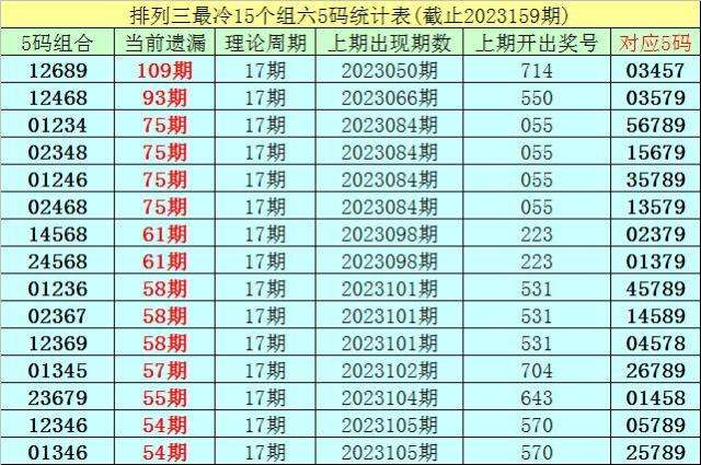 (4)排列三第2023159期遗漏值最大的十个5码组六组合解冻了0个;