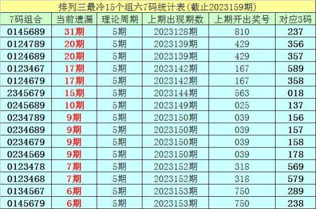 (1)在排列三已开出的6580期奖号中(统计截止第2023159期),目前7码组六遗漏值最大的组合为:0145689,本期遗漏31期;