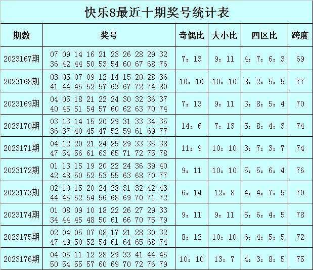 福彩快乐8第2023176期开奖回顾:04 05 11 12 28 29 33 41 44 45 50 54 55 57 60 69 70 72 76 79,其中奖号012路比为8:6:6,奖号尾数012路比为8:6:6。