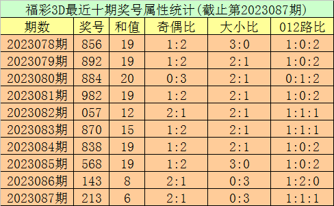 开奖回顾:第2023087期福彩3D奖号为213。奖号形态为组六,大小比为0:3,和值为6,奇偶比为2:1,012路比为1:1:1,跨度为2。