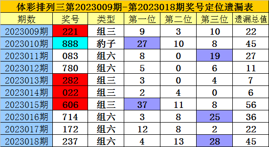 开奖回顾:排列三第2023018期奖号为:237,各位号码遗漏值分别为4、13、28,遗漏总值为45。