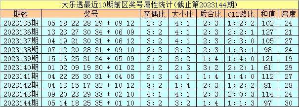 开奖回顾:体彩大乐透第23144期开出奖号为:05 14 18 25 35+01 10,前区012路比为1:1:3,质合比为1:4,奇偶比为3:2,大小比为3:2,后区012路比为0:2:0,质合比为1:1,奇偶比为1:1,大小比为1:1。