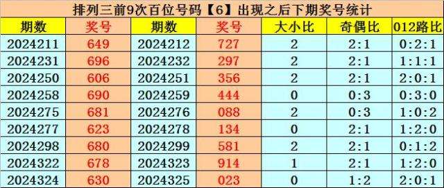 百位号码:百位上期奖号为1路、奇数、大号:6,历史上百位号码6共开出710期,前一次开出期数在第2024324期,上期奖号隔7期再次开出。