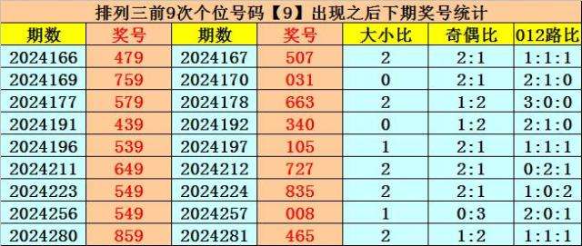 个位号码:上期奖号为大号、奇数、0路号码:9,历史上个位号码9共开出747期,前一次出现在第2024280期,上期遗漏51期再出。