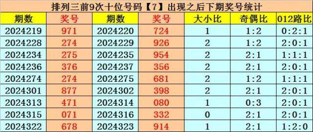 十位号码:十位上期开出奇数、大号、1路号码:7,历史上十位号码7共开出695期,上一次出现在第2024322期,上期奖号遗漏值为9期。