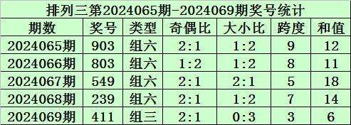 上期回顾:排列三第2024069期开奖号码为411。奖号类型为组三,奇偶比为2:1,大小比为0:3,跨度为3,和值为6。