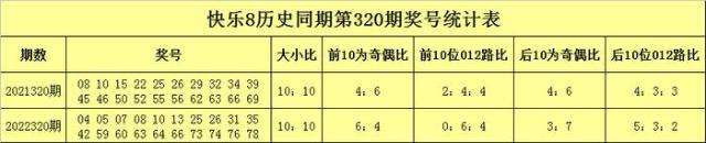 从上表可以看出,在第320期历史同期开奖中,前10为号码奇偶比为10:10,奇偶号码出现频次相等,去年同期前10位以奇数号码为主,开出了6个奇号,今年同期前10位注意偶数号码适当回补,关注奇偶比4:6,看好号码01、10、11、12、14、18、20、22、27、33。