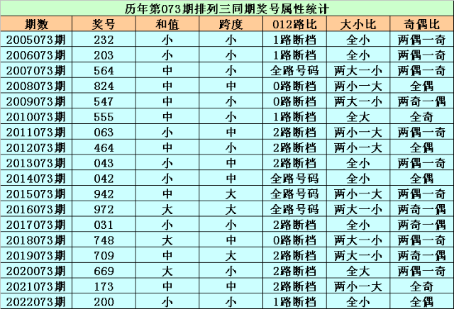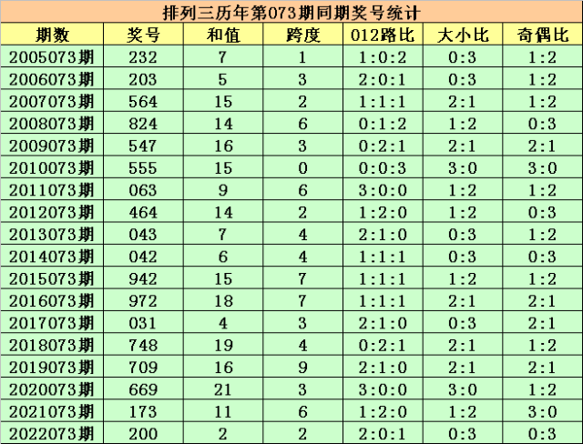 历史上第2023073期排列三已开出18期奖号了,历年同期奖号分别为:232、203、564、824、547、555、063、464、043、042、942、972、031、748、709、669、173、200,详细统计见下表: