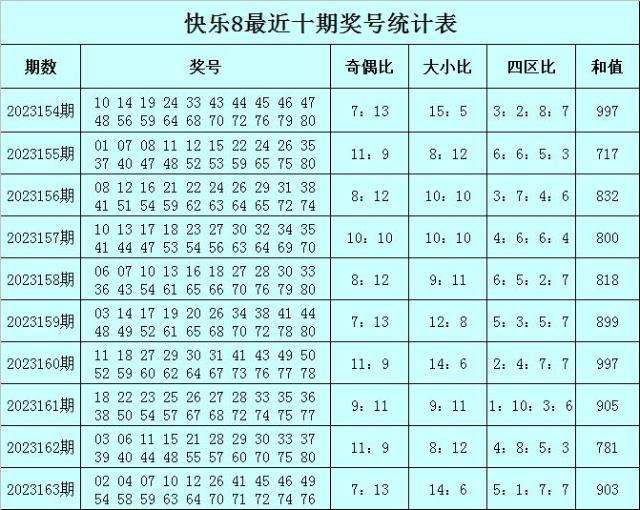 福彩快乐8第2023163期开奖回顾:02 04 07 10 12 26 41 45 46 49 54 58 59 63 64 70 71 72 74 76,其中奖号四区比为5:1:7:7,奇偶比比为7:13,大小比为14:6,和值为903。