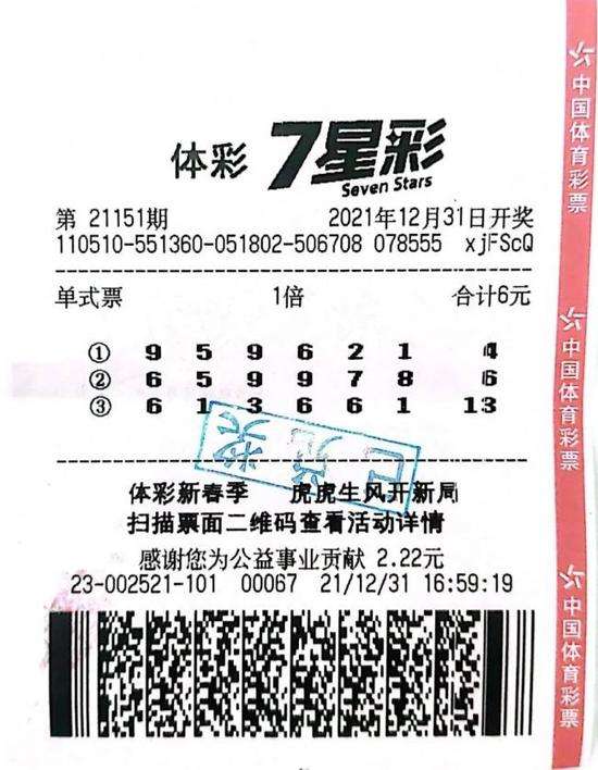 体彩7星彩第21151期开奖,开出号码613661+13,当期全国共开出2注一等奖,四川省成都市青羊区5123002521体彩店中出一等奖1注,奖金500万元。大奖得主手持的中奖彩票是一张3注号码的单式票,投入6元。