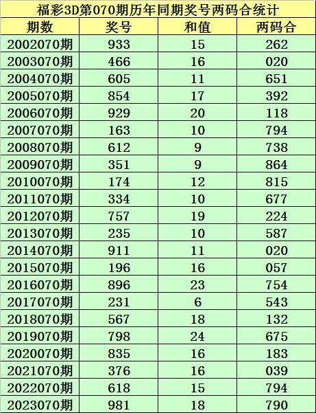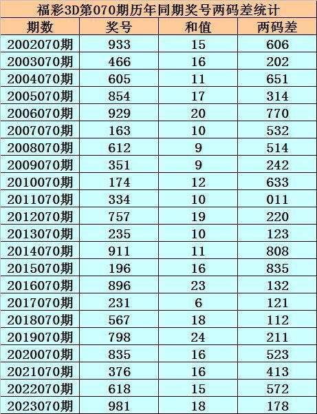 福彩3D第070期,历史上期开出22次奖号,其奖号分别为:933、466、605、854、929、163、612、351、174、334、757、235、911、196、896、231、567、798、835、376、618、981,奖号两码合差分别开出: