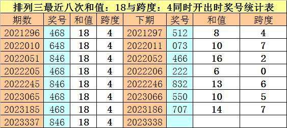 开奖回顾:体彩排列三第2023337期奖号为:846。和值为:18,跨度为:4。