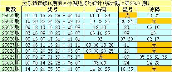大乐透第25022期-第25031期前区奖号冷温热分布统计: