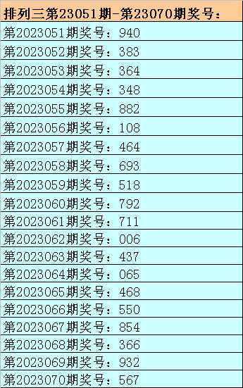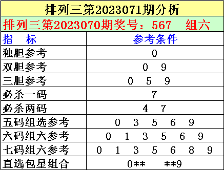 1。排列三最近十期分别开出号码:711-006-437-065-468-550-854-366-932-567,其中有4期奖号开出了上期的重复号码,本期预计第2023070期奖号:567中有重号,参考号码:5。