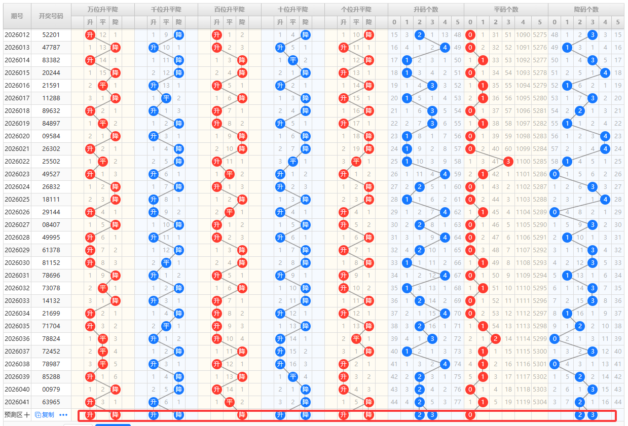 升平降举例:对单选号码来说,在一个位置上如果本期的数字大于上期的数字则为升码,如果等于上期的数字则为平码,如果小于上期的数字则为降码。