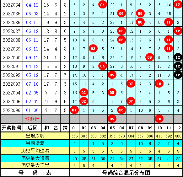 3。出号统计:05号码没有出现,12号码开出次数最多,为5次。