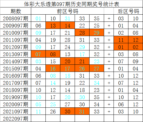 体彩大乐透第097期历史上已开出了14次,其奖号分别为: