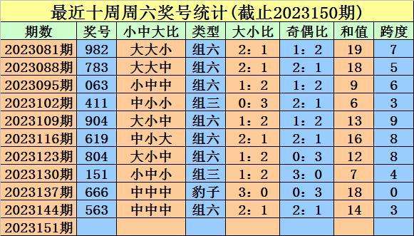 奖号类型判断:近期周六组六明显活跃,近十周开出7次,上周六为组六,组三出现较少,本周六看好在组六。