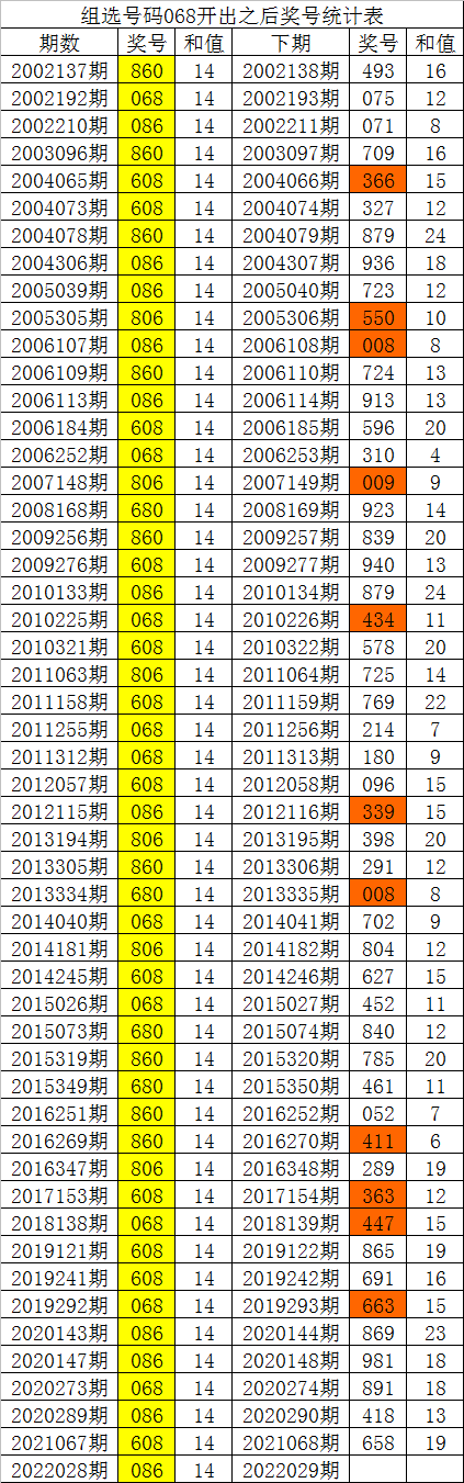 福彩3D第2022028期开出组选号码:068,该号码历史上组选出现了52次,其下期分别开出了号码:493、075、071、709、366、327、879、936、723、550、008、724、913、596、310、009、923、839、940、879、434、578、725、769、214、180、096、339、398、291、008、702、804、627、452、840、785、461、052、411、289、363、447、865、691、663、869、981、891、418、658,如图: