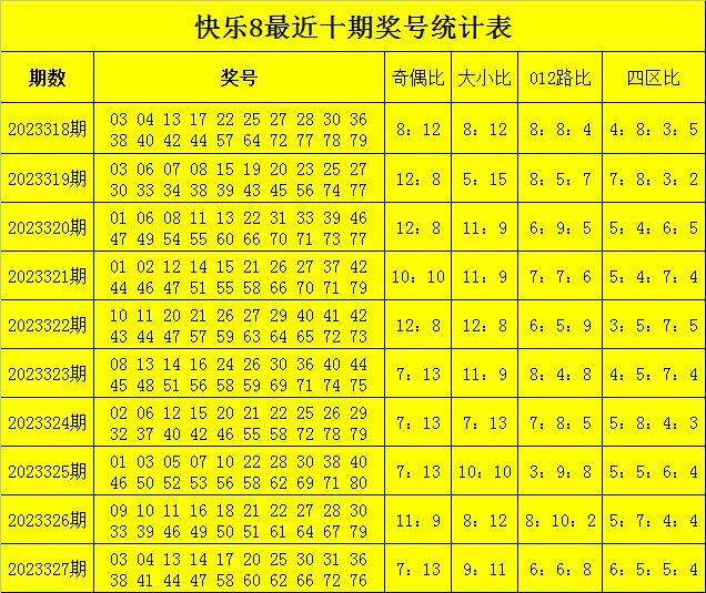 福彩快乐8第2023327期开奖回顾:03 04 13 14 17 20 25 30 31 36 38 41 44 47 58 60 62 66 72 76,其中奖号大小比为9:11,012路比为6:6:8,和值为757,跨度为73,奇偶比为7:13。