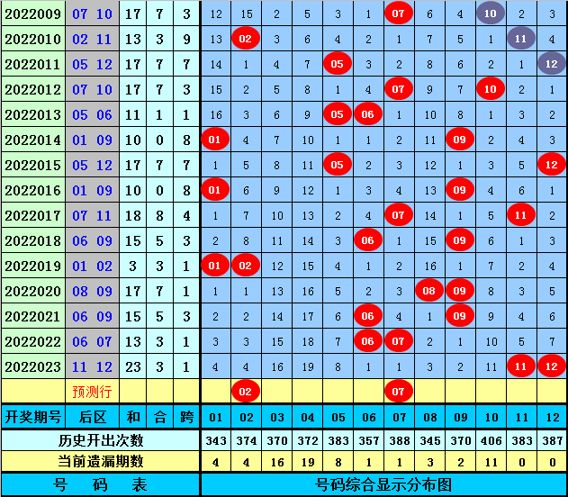 后区分析:上期后区奖号为11+12,遗漏期数为5期+7期。,目前后区热码有6个:06、07、08、09、11、12,后区温码有3个:01、02、05,后区冷码有3个:03、04、10,本期后区看好号码02、03、07、09、12,单挑一注02+07。