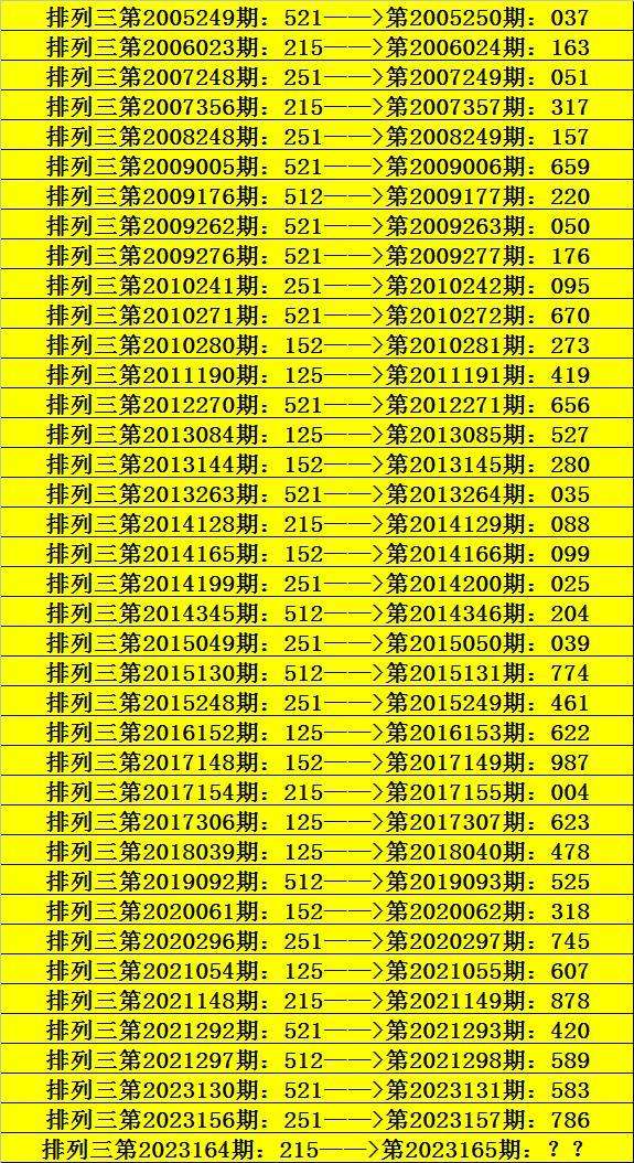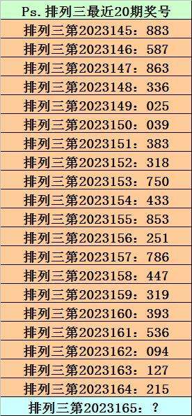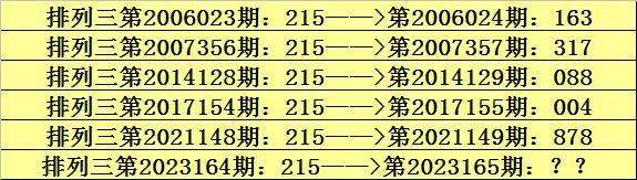 第2023164期排列三奖号为215,历史上该号码直选出现6次,下期奖号分别为:163、317、088、004、878。