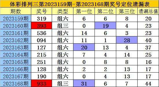 开奖回顾:排列三第2023168期奖号为:933,各位号码遗漏值分别为31、6、7,遗漏总值为44。