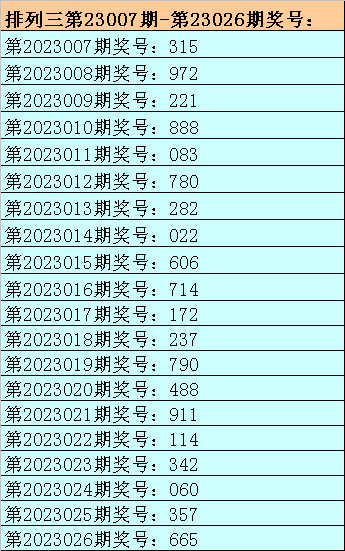 1。排列三最近十期分别开出号码:172-237-790-488-911-114-342-060-357-665,其中有6期奖号开出了上期的重复号码,本期预计第2023026期奖号:665中有重号,参考号码:6。