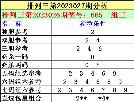 3。当前排列三组六遗漏最大的七码组合为:0125689,遗漏26期,本期不看好解冻,预计剩余三码中有出号,关注号码:4。
