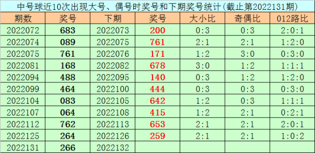 中号球:上期奖号为6,开出大号、偶号,该位前10次开出大号、偶号的现象时其奖号分别为:683、089、761、168、488、464、083、064、762、264,其中中号球012路比为6:0:4。