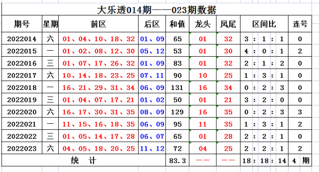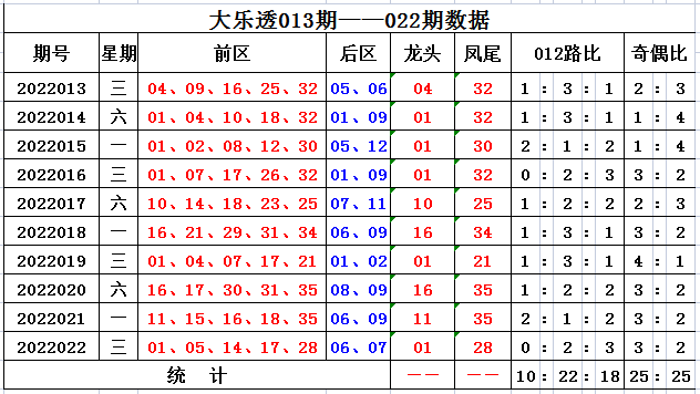 2022023期前区04 05 18 20 25;后区11 12。当期前区号码大小比为3:2,三区比为2:2:1,奇偶比为2:3。前区开出1组连号04 05;1组同尾号05 25;1枚重号05。后区两码遗漏期数分别为5期和7期。