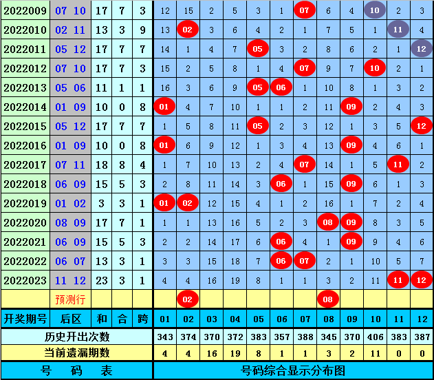 后区分析:上期后区奖号为11和12遗漏期数分别为5期和7期,目前后区遗漏5期以内的热码有8个:01、02、06、07、08、09、11、12,遗漏4期以上的热码有4个,本期后区两码看好热号,注意号码02、08。