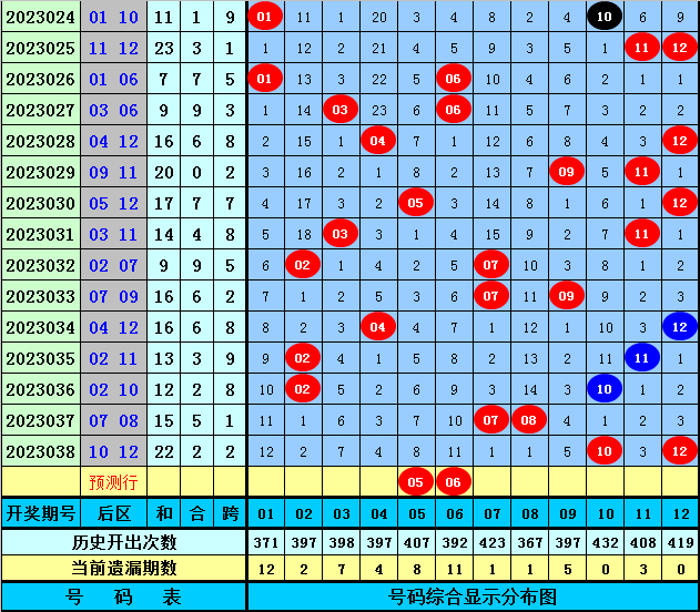 后区分析:上期后区奖号为10和12,最近5期后区和值分别为16、13、12、15、22,后区跨度分布范围在1-9,本期后区注意两码05、06。