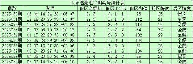 大乐透第2025039期开奖,前区:03、07、14、15、19;后区:06、10。其中前区和值为58,跨度为16,012路比为2:2:1,奇偶比为4:1,后区开出全偶、0路+1路组合。
