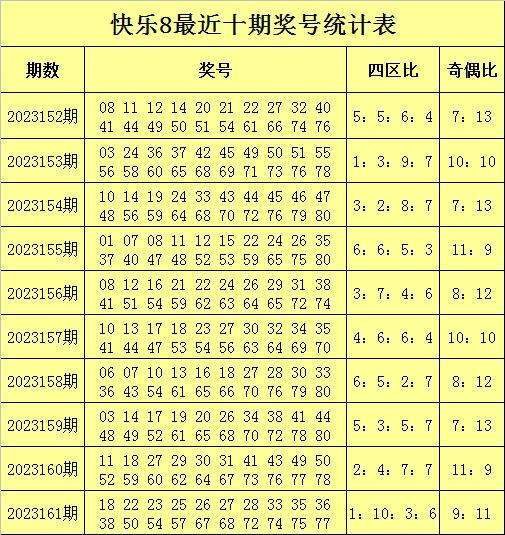 福彩快乐8第2023161期开奖回顾:18 22 23 25 26 27 28 33 35 36 38 50 54 57 67 68 72 74 75 77,其中奖号四区比为1:10:3:6,奇偶比为9:11。
