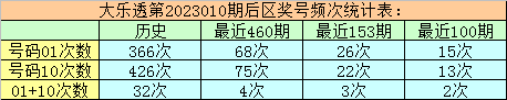 万妙仙大乐透第2023010期前区热号分析:(统计最近460期数据)