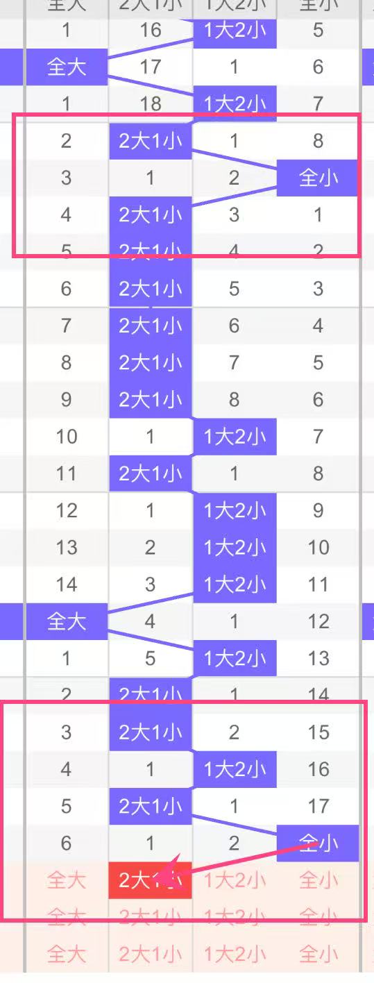 2,大小分析:上期全小组合意料之中的,遗漏17期终于开出,走势图推荐2大一小组合,防守两小一大。