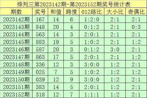 开奖回顾:排列三第2023152期奖号开出:318,组选类型:组六,大小比为1:2,奇偶比为2:1,和值为12,跨度为7。