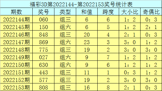 154期庄德福彩3D预测奖号:奇偶和值跨度分析