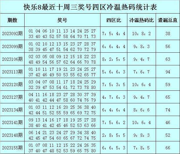 福彩快乐8第2023155期(上周三)开奖回顾:01 07 08 11 12 15 22 24 26 35 37 40 47 48 52 53 59 65 75 80,其中奖号四区比为6:6:5:3,冷温热码比为5:8:7。