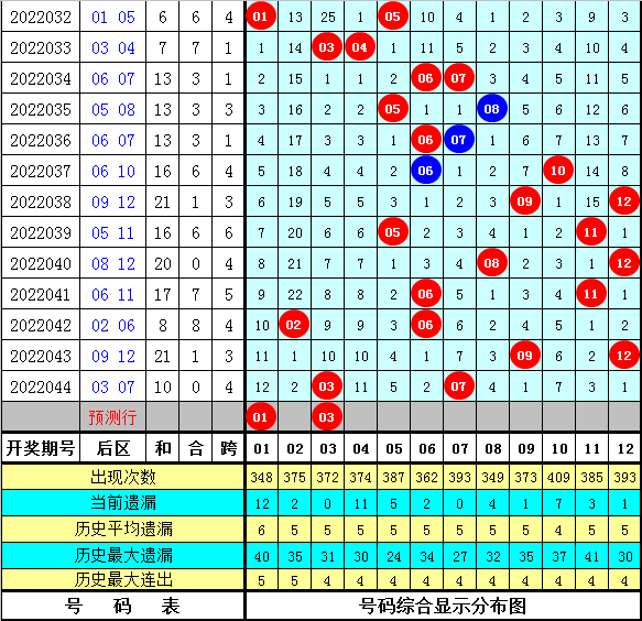 后区分析:上期后区奖号为03+07,本期后区注意重复号码出现,大范围参考号码01、03、08、12。