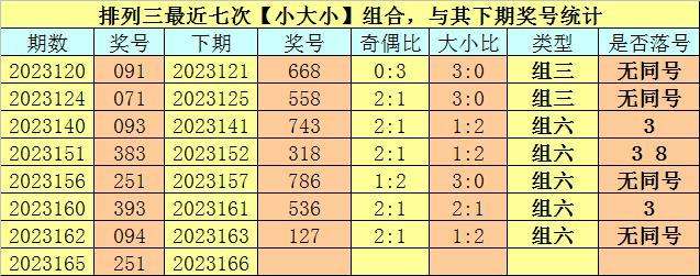 奖号类型分析:排列三最近七次【小大小】组合与【偶奇奇】组合出现之后,其下期组三号码开出4次,组六号码开出10次,其中组六号码开出频率非常热,本期预计继续开出组六号码。另外,其下期有6期没有出现重号,本期不看好开出重号。