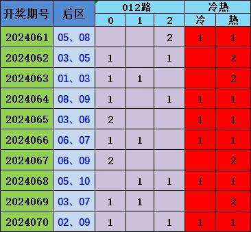 上期后区开出奖号02 09,近10期012路比10:4:6,0路号码较热,2路号码较温,1路较冷,0路参考号码“03 06 09”,2路参考号码“05 08”,近10期冷热比6:14,热码形式较好,综合分析,精选号码05 08。